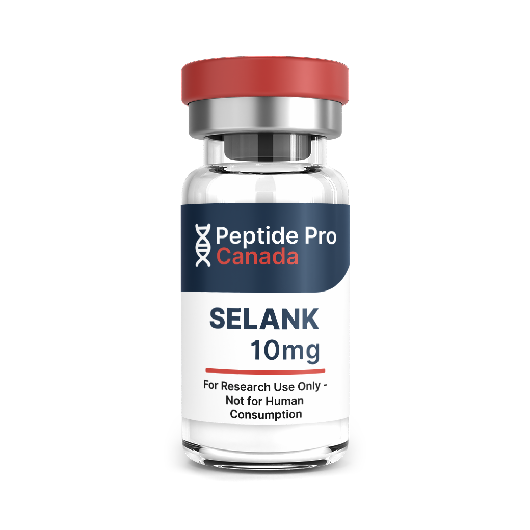 Selank Canada is supplied as a 10mg lyophilized research peptide in a sterile 3mL vial. Ships from Ontario. For laboratory research only — not for human use.