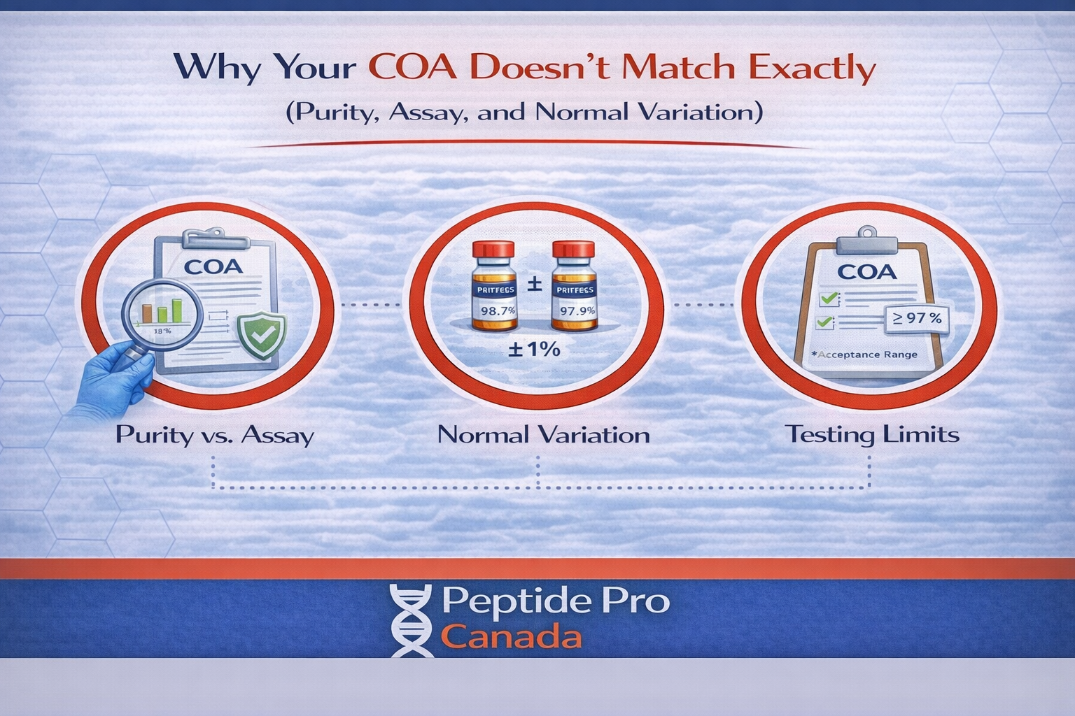 If you’re buying from a research peptides Canada vendor, you’ll sometimes see a COA number that isn’t what you “expected.” People fixate on one value and assume something is wrong. Most of the time, it’s a misunderstanding: purity vs assay, method differences, rounding, and normal batch variation.